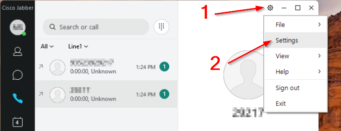 Once Jabber is open, click the Gear icon in the upper-right (1) of the application window and select Settings from the resulting dropdown menu (2).