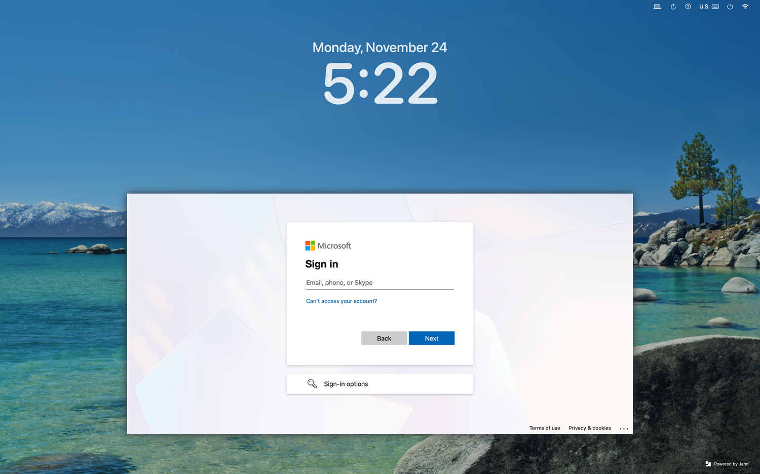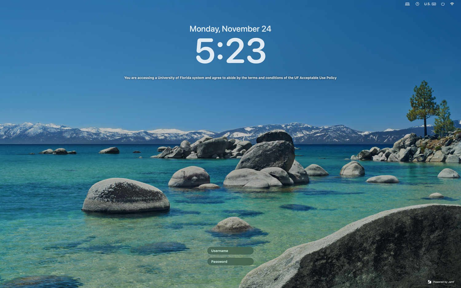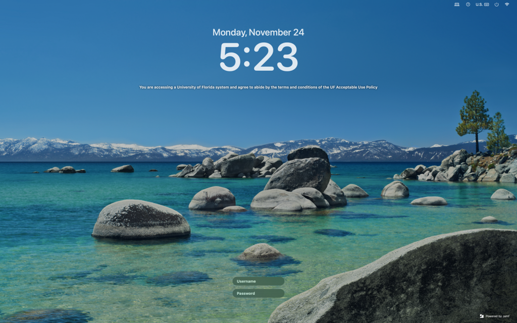 Note the UF Acceptable Use Policy underneath the clock and “Powered by Jamf” in the lower right corner which indicates that Jamf Connect Login has been installed.