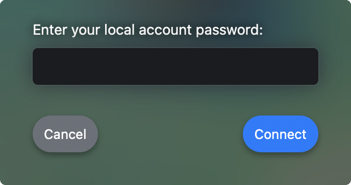 If your local username is different from your Gatorlink then you will see the above menu. Please select the ‘Connect’ button underneath YOUR local Mac account which will then prompt you to enter the local account password. It is the password you previously used to log into your Mac account before Jamf Connect Login was installed. You can also create a new account at this step, but the account will be a standard user account without administrator privileges.